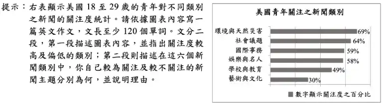 從過去兩次出現圖表題來看,圖表題通常會給學生 6-7個圖表資訊,且都是柱狀圖 (bar chart)。